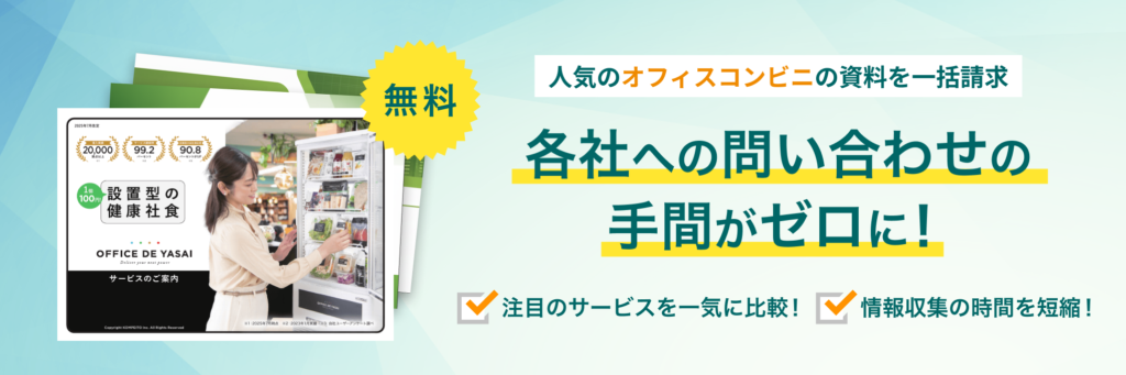 オフィスコンビニには多くの種類があり「どれを選べばいいか」迷いますよね。後から知ったサービスの方が適していることもよくあります。導入の失敗を避けるためにも、まずは各サービスの資料をBOXILでまとめて用意しましょう。