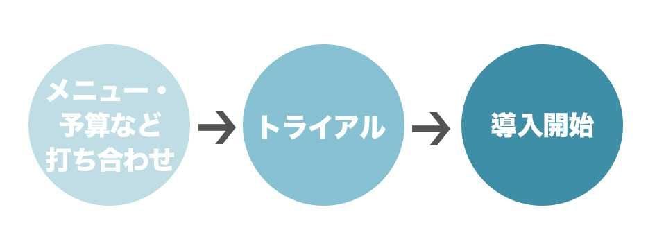 導入には上記の通り、メニューや予算など詳細の打ち合わせ、トライアル、導入という3つのステップが必要で、導入までの期間はすべて含めて1か月程度です。1か月の中にはトライアルも含まれているので実質的にはそれほど期間は必要ありません。