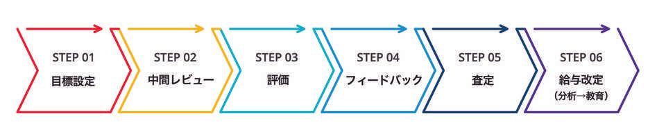 目標設定・中間レビュー・評価・フィードバック・査定・給与改定(分析+教育)と、6つのステップで人事評価業務を行います。