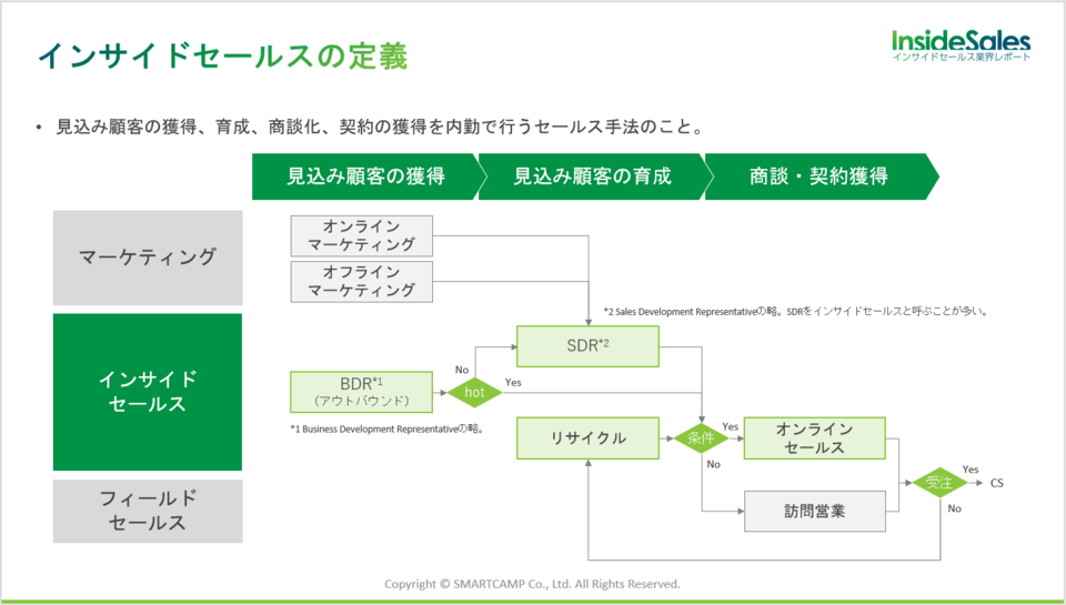 見込み顧客の獲得を内勤で行うBDR(Business Deveopment Representative)、見込み顧客の育成・商談化を内勤で行うSDR(Sales Development Representative)、商談・契約獲得を内勤で行うオンラインセールスに大きく分かれ、SDRをインサイドセールスと呼ぶことが中心です。