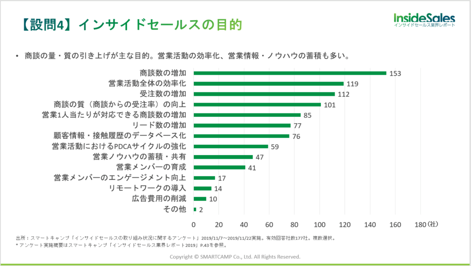インサイドセールスは主にSDRによる商談数の増加に加えて、BtoBマーケティング・セールスプロセスにおける分業の実現、案件化率・受注率の高い商談のみのアポイント創出、リモートによる営業アプローチなどによる営業活動全体の効率化のために導入されます。