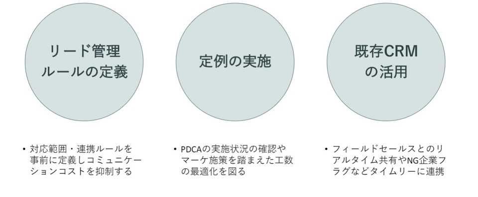阿部「ハイブリッド型をうまくまわすためには、商談化に必要な情報やランク付けなど、リードを管理するためのルールをすり合わせて運用するのが重要です。また、関連メンバーでコミュニケーションをとってPDCAを回していくために、定例MTGは欠かせません。