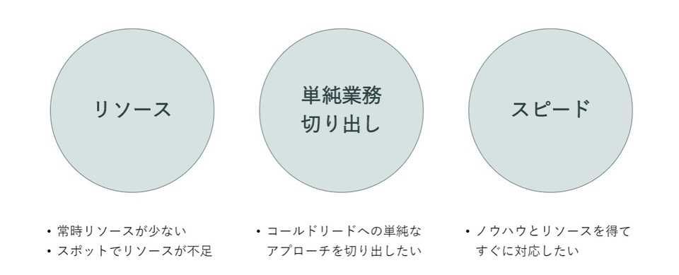 阿部「1つ目は商談獲得です。展示会に出展した後や、広告をまわした後はリードが集中しますよね。でも社内のリソース不足でさばききれない場合に、外注するというケースです。