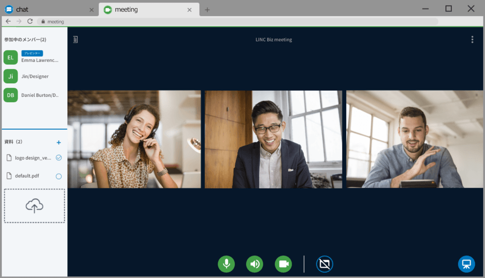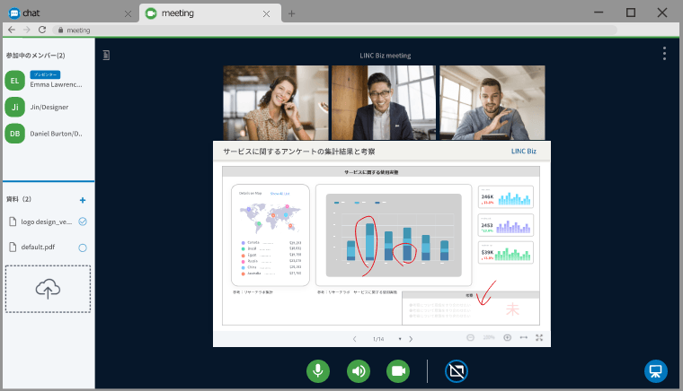 LINC Bizではチャットと音声/ビデオ機能がセットになっていることにより、チャット上で音声/ビデオ会議の資料を共有でき、資料を見ながらミーティングを進められます。さらに、テキストや手書きで、会議で使用している資料に参加者が書き込みでき、会議後のファイルをチャットに自動投稿する機能もあります。