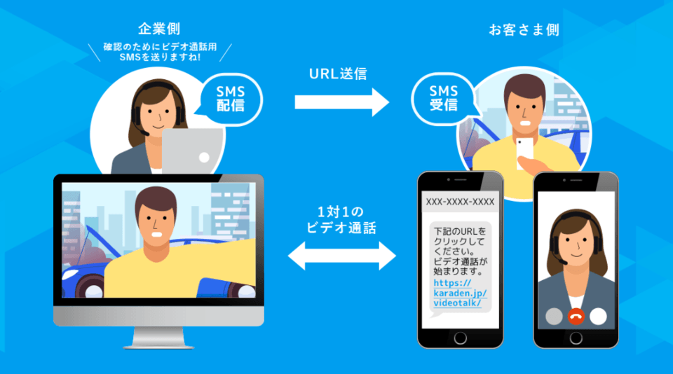 前述したとおり、「ビデオトーク」の最大の魅力は、企業からユーザーに対してビデオ通話用URL付きのSMSを送るだけで、簡単にPC to スマホのビデオ通話を実現できる点だ。