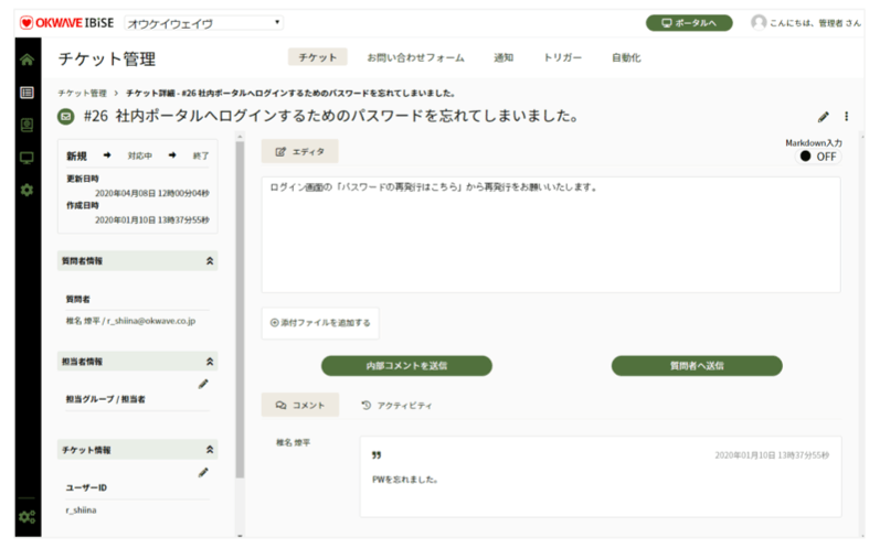 「OKWAVE IBiSE」では、メールやチャットなどさまざまなチャネルから来た問い合わせを「チケット」として登録する。そのチケット情報を社内で共有しつつ、担当者に割り振り、新規/対応中/終了などのステータスで管理していくのだ。メモ機能を使えば社内メンバーへのコメントも行えるため、管理者によるメンバーへのアドバイスや教育もツール上で完結する。