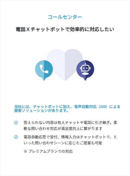 プレミアムプランでは電話自動対応で受付を実施、情報入力はチャットボット、チャットボットで処理できない案件は有人チャットや電話に引継ぎをするといった、柔軟なオペレーションが可能となります。