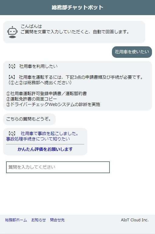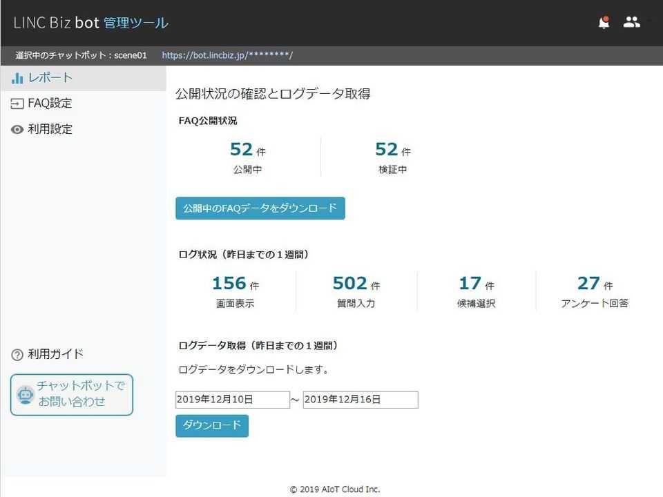 - ログ取得:対話ログを取得し、FAQ改善に活用できる機能