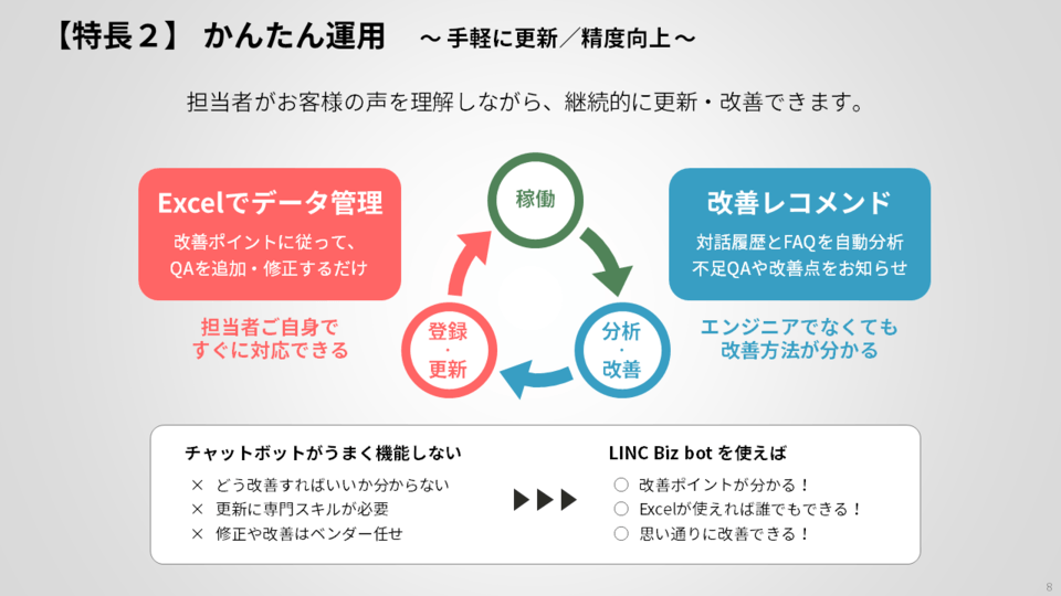 LINC Biz botは、使い慣れたExcelでQ&A管理できるため容易に導入でき、精度向上のポイントを自動で通知されるため、運用・改善が簡単に行えます。