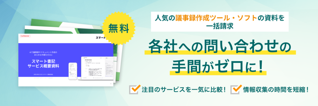 【特典比較表つき】『議事録作成ツール・ソフトの資料10選』 はこちら⇒ 無料ダウンロード