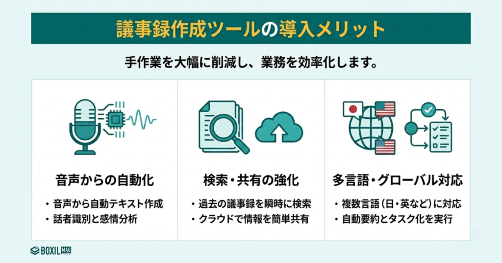 また、情報共有の簡素化も大きな利点です。作成した議事録は容易に共有でき、検索機能により過去の議事録も迅速に参照できるため、業務効率が大幅に向上します。さらに、多言語対応機能を備えたツールでは、リアルタイム自動翻訳により翻訳作業が不要となり、グローバル企業での会議進行が円滑になります。