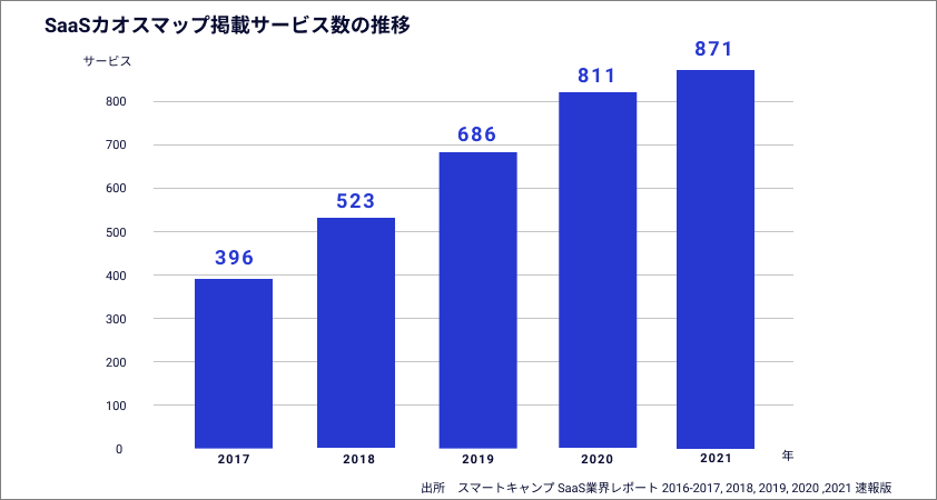 改めて、SaaS管理が必要とされる環境を整理します。2020年度の国内SaaS市場は、2019年度比123.7%の1兆332億円となり、2024年度には1兆6,054億円に達すると予測されています※1。市場拡大とともに、市場に出回るサービスも増加※2。新たな領域のSaaSが次々と登場している状況です。