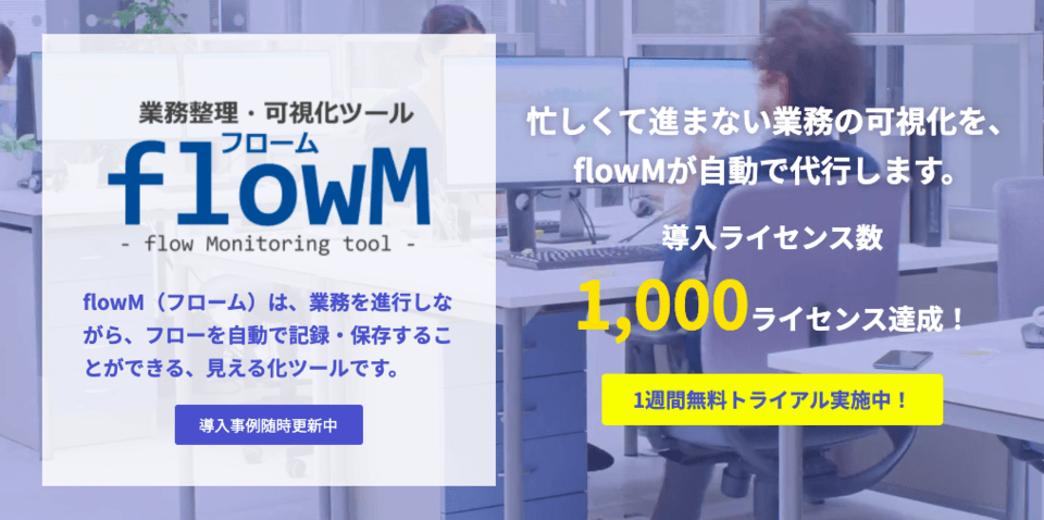 「flowM」は、業務を進行しながらそのフローを自動で記録・保存できる業務管理・可視化ツールです。パソコン上のクリック操作、キーボード操作などキャプチャした操作画面は、Excel形式で記録されます。業務マニュアル作成や業務の洗い出しに課題感を持つ企業に適したツールと言えるでしょう。