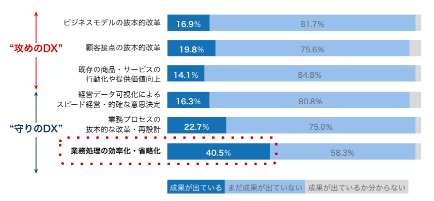 DXには、攻めと守りの2種類があると考えています。攻めのDXは自社だけでなく顧客や社会に影響を与える、ビジネスモデルそのもののデジタル化。守りのDXは、自社内でコントロールする業務プロセスのデジタル化です。システムの導入で業務の効率化を行う守りのDXは比較的取り組みやすいのですが、せっかく導入したシステムも運用が浸透しないのでは業務の効率化にはつながりません。