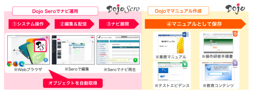 マニュアル自動作成ソフト「Dojo」との連携でマニュアルの作成と運用をさらに効率化できるのも魅力だ。
