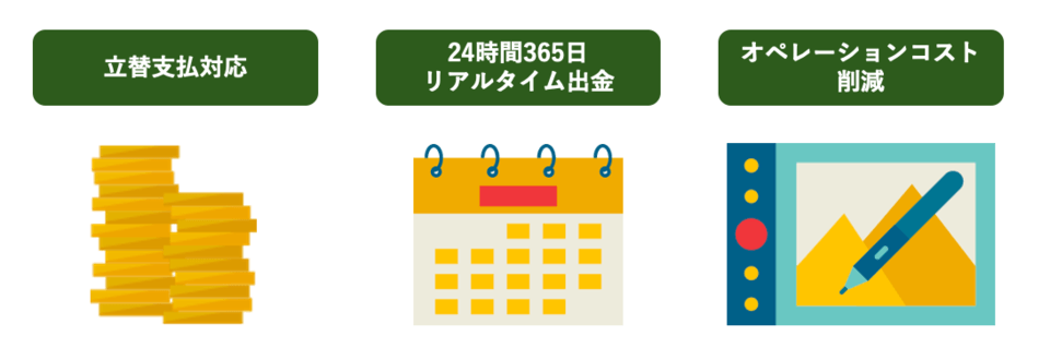 24時間365日リアルタイム(※)での出金が可能。返金や買取金の支払いや、プラットフォームからの出金など、顧客の手元に早く届けられるため、顧客満足度向上に貢献する。
