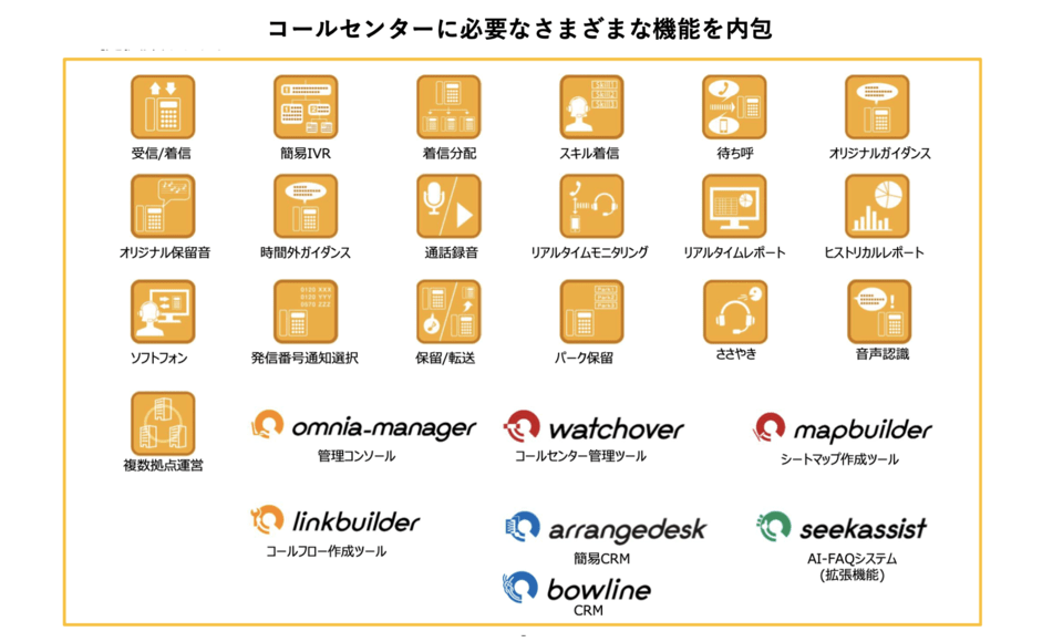 「Omnia LINK」最大の特徴は、「これひとつでコールセンターに必要な機能をすべてカバーできる」点にある。PBX機能だけでなく、管理者向け機能やコールフロー作成機能、さらにリアルタイム音声認識機能まで備えるため、機能ごとにさまざまな製品を合わせる必要がなく、コスト削減と運営効率化を可能にする。