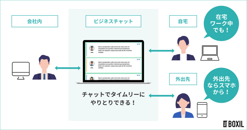 ビジネスチャットとは、LINEやMessengerアプリのようなチャットによるコミュニケーションツールのビジネス版です。
