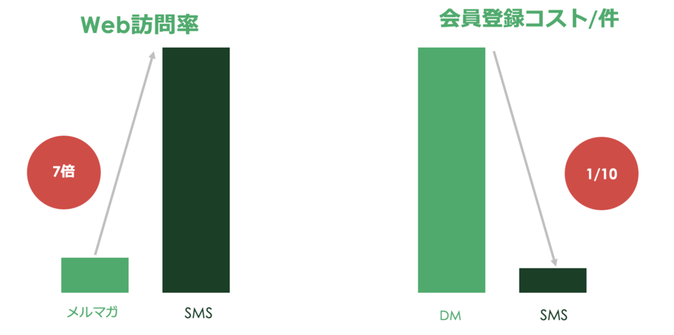 さらに、サービス登録1件あたりのプロモーションコストの観点でも、SMSはDMの10分の1以下のコストでユーザー登録を獲得できた。非アクティブな会員に対する情報訴求として、SMSは極めて有効であることが証明されたのだ。