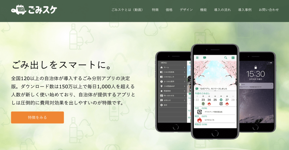 「ごみスケ」は、全国120以上の自治体が導入するごみ分別アプリです。ごみ収集日の確認やごみの出し忘れ防止、ごみの出し方を検索できる辞典機能など、日々の生活で発生するごみに関する問題を解決するため機能が搭載されています。ダウンロード数は150万以上、毎日1,000人を超える人が新しく使い始めています(※2021年5月18日時点、G-Place調べ)。