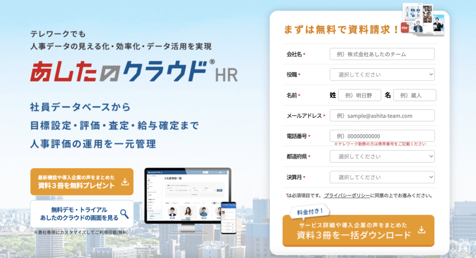 「あしたのクラウド」は、社員データベースから、目標設定・評価・査定・給与確定まで人事評価の運用を一元管理する人事評価クラウドサービスです。AIによる「目標添削機能」「評価者モニタリング機能」など、他社にはない技術で人事評価における課題解決を実現します。サービス導入企業3,500社の確かな実績で人事評価の悩みを解決します。