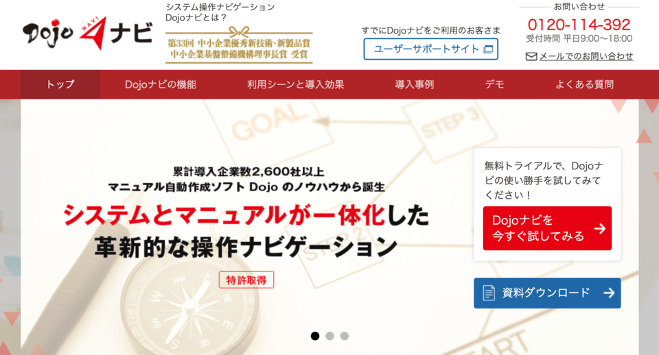 「Dojoナビ」は、Webシステム画面上にナビゲーションを直接表示できる次世代マニュアルソリューションです。Dojoナビの利用により、マニュアルを探して読む手間や、操作研修の受講の手間が削減できます。ナビゲーションは直感的な操作で作成でき、運用の早期定着、業務効率化とあわせ、システム導入のハードルを下げることで、企業のDX推進に貢献します。