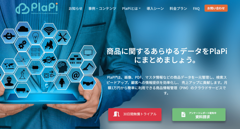 「PlaPi」は、月額1万円から利用できる商品情報管理(PIM)のクラウドサービスです。画像、PDF、マスタ情報などの商品データを一元管理し、検索のスピードアップや顧客への情報提供を効率化するとともに、 売上アップに貢献します。