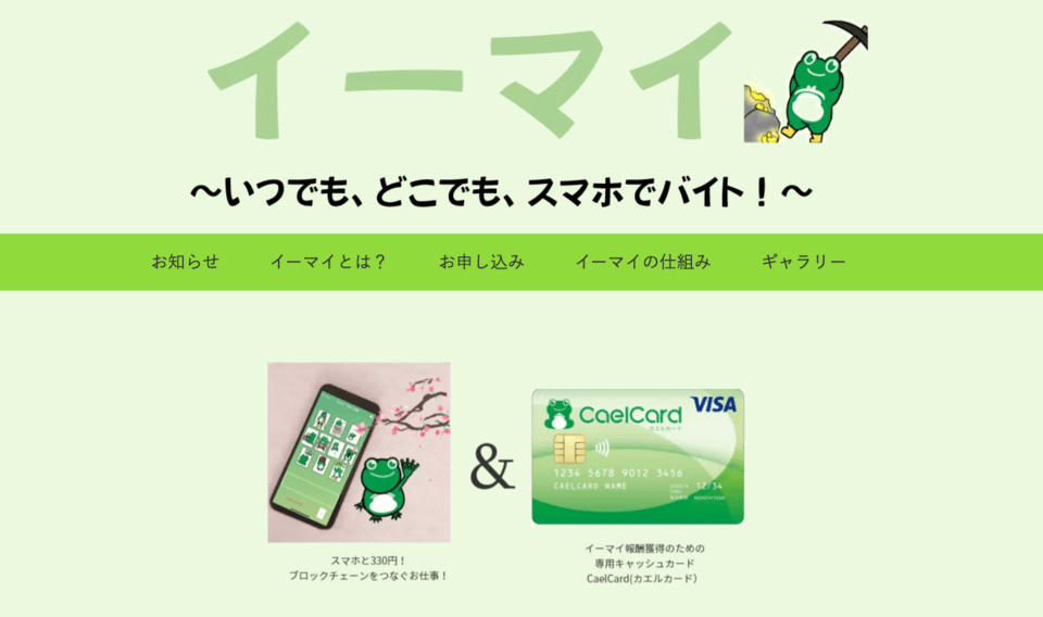 「イーマイ」は、ブロックチェーンを使ったリモートジョブサービスです。データをブロックチェーンによって安全に保管するためには「マイニング」という作業が発生します。専門知識や経験がなくても誰でも簡単にマイニング作業ができるように、スマートフォンゲーム風に可視化したものが「イーマイ」です。