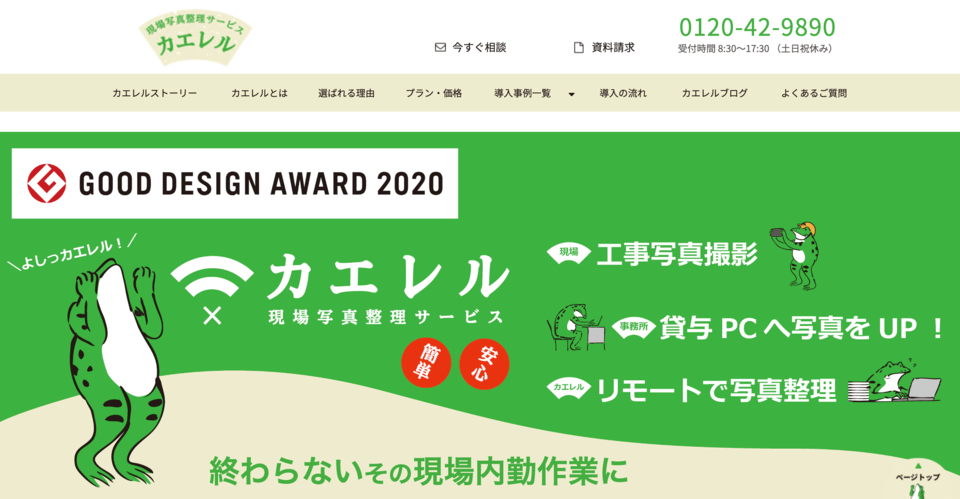 「カエレル」は、建設現場で負担になっている写真整理を代行し、業務効率化を図る現場写真整理サービスです。現場写真の撮影・管理には、大変な時間と労力が必要ですが、一定の知識も必要です現場経験・ノウハウのある社員が代行を担当。カエレルを利用することで、現場技術員の1ヶ月あたりの残業時間を4分の1にまで軽減できた事例もあるとのことです。