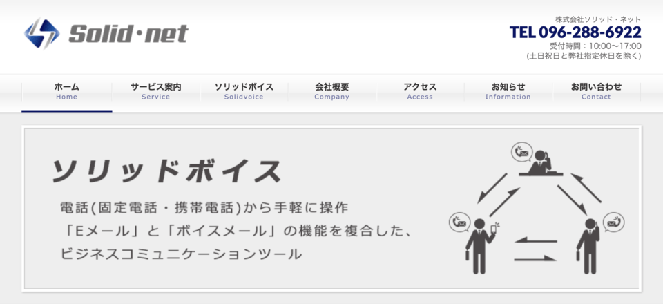 「ソリッドボイス」は、電話機(固定電話・携帯電話)から手軽に操作できる「Eメール」と「ボイスメール」の機能を複合した、ビジネスコミュニケーションツールです。スマートフォンアプリも用意されており、スムーズでスピーディな社内コミュニケーションを実現します。