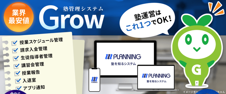 「Growシステム」は、学習塾の運営に特化した管理システムです。授業スケジュール管理、請求入金管理、生徒指導者管理、講習会管理のほか、授業報告や入退室、アプリ通知などの機能を備え、学習塾の事業運営を効率化します。