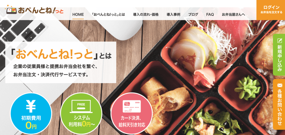 「おべんとね!っと」は、企業の従業員と提携弁当会社をつなぐお弁当注文・決済サービスです。お弁当を注文したい従業員本人が直接PCやスマホから注文・キャンセルが可能。総務担当など、団体の代表者が個数を取りまとめて弁当屋に注文する必要がありません。また、お弁当の注文時にクレジットカードでの決済が可能なので、現金回収や給与天引きの業務が不要です。