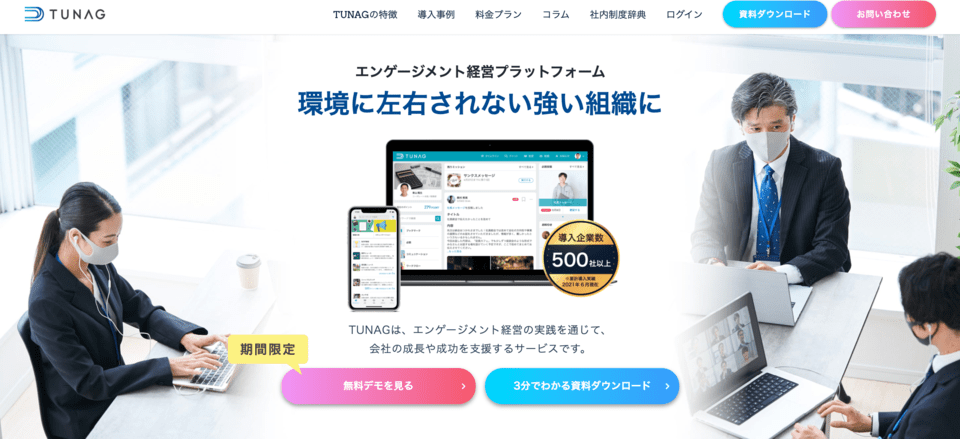 「TUNAG」は、エンゲージメント経営の実践を通じて、企業の成長や成功を支援するサービスです。経営者の想いや考えを形にした「社内制度」に沿った情報が共有されるほか、タイムラインで会社や人の今を知り、プロフィールで従業員の顔や名前を一致させて気軽なコミュニケーションのきっかけを生み出します。経営者の考えや想いを社内に循環させることで、従業員の行動変化を促します。