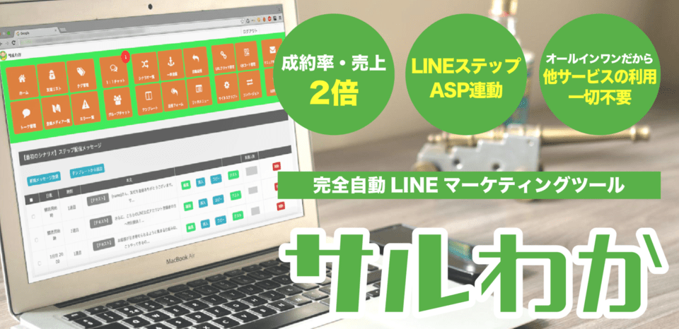「サルわか」は、LINE公式アカウントを自動化するマーケティングツールです。あらかじめ準備したメールをスケジュールに沿って配信するステップメール配信機能を搭載。URLクリック測定機能も用意されているため、顧客行動に応じた適切なマーケティング施策を実行できます。