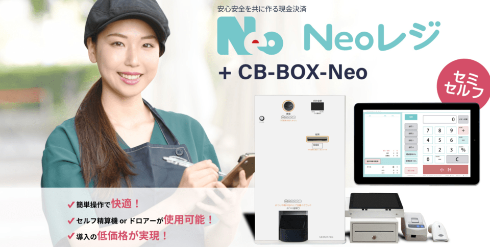 最近、人材不足の解消や新型コロナウイルス対策を目的としてセルフレジを導入する企業が増えていますが、小規模店舗に注目してほしいのが「CB-BOX-NEO/Neoレジ」です。電子返却ユニット搭載のセミセルフ精算機と、専用レジアプリによって、スムーズな精算対応やレジの混雑解消を実現します。
