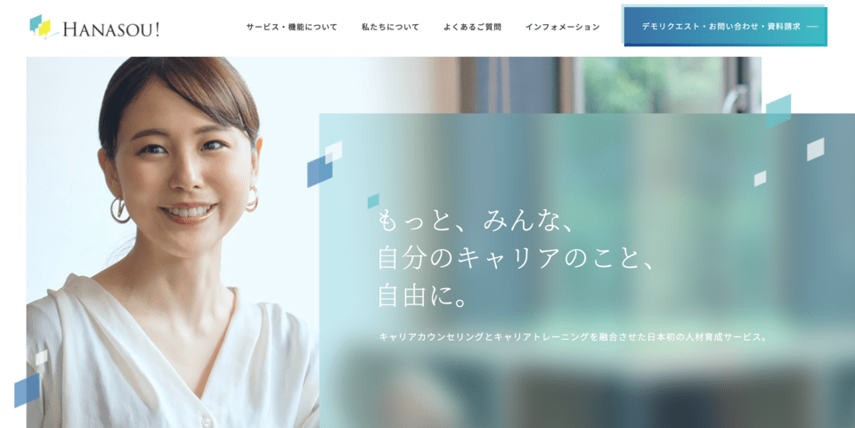 「HANASOU!」は、キャリアカウンセリングとキャリアトレーニングを融合させた人材育成サービスです。カウンセラーとのマッチング(属性マッチング)や、キャリアの棚卸し(キャリアエンゲージメントノート)、目標管理(MBO)達成サポートなど、豊富な機能を搭載。従業員のキャリアに関する悩みの解消をサポートします。