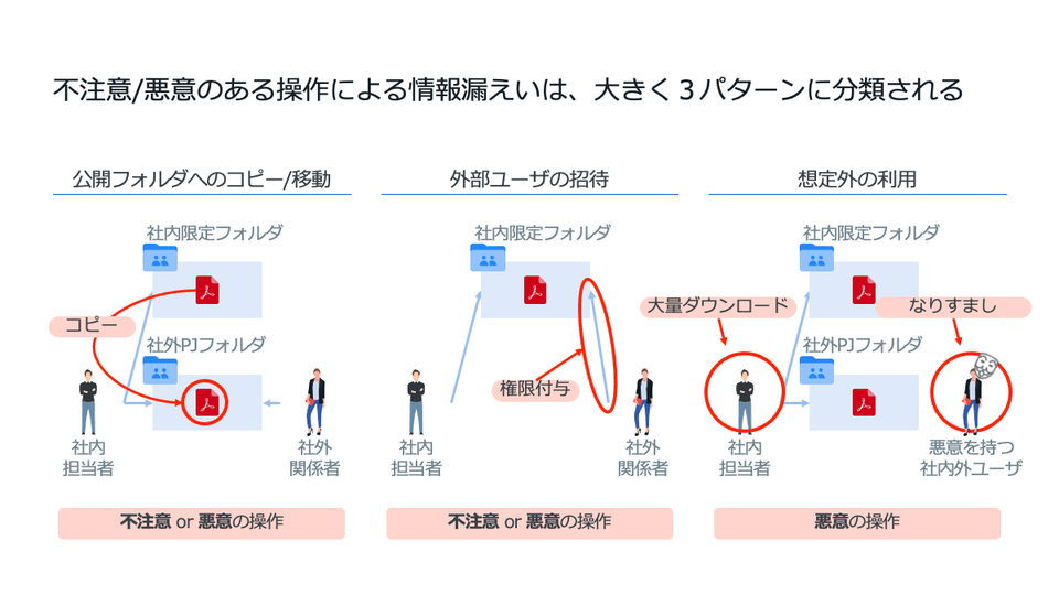 セキュリティ事故は内部犯行やうっかりミスが多いのです。退職者が重要データを持ち出したり、間違った人にデータを共有してしまったり。Box Shieldでは、間違った共有をしようとしてもできないよう、コンテンツを分類しシステムでガードをかけ保護しています。