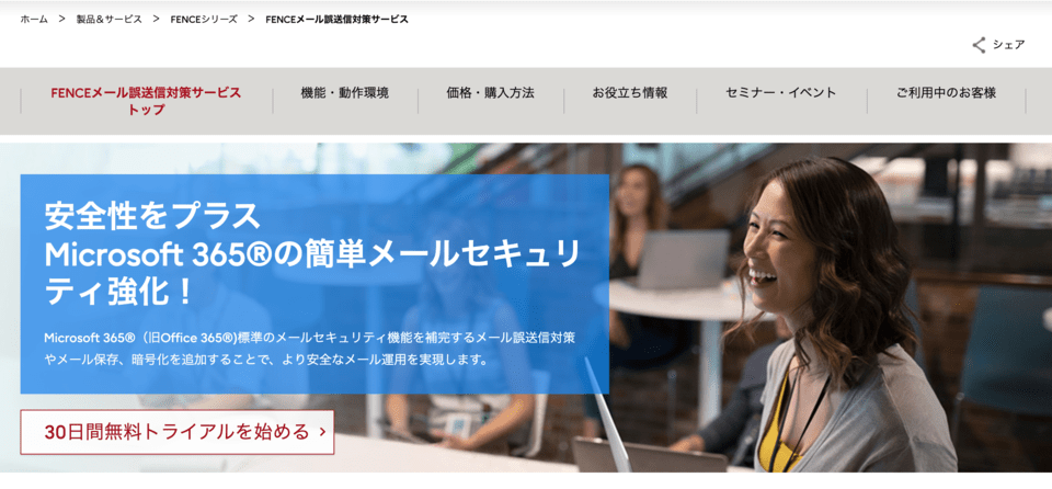 「FENCEメール誤送信対策サービス」は、Microsoft 365(旧Office 365)標準のメールセキュリティ機能を補完するメール誤送信対策やメール保存、暗号化を追加することで、より安全なメール運用を実現します。
