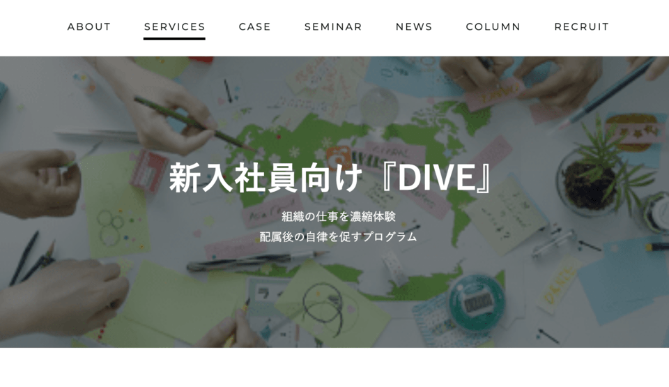 「DIVE」は、リアルな仕事体験ができる新入社員向けシミュレーション研修です。講義形式の研修では得られない体験を通じて、自ら動く重要性を実感し、組織の一員として仕事をする自覚を醸成します。