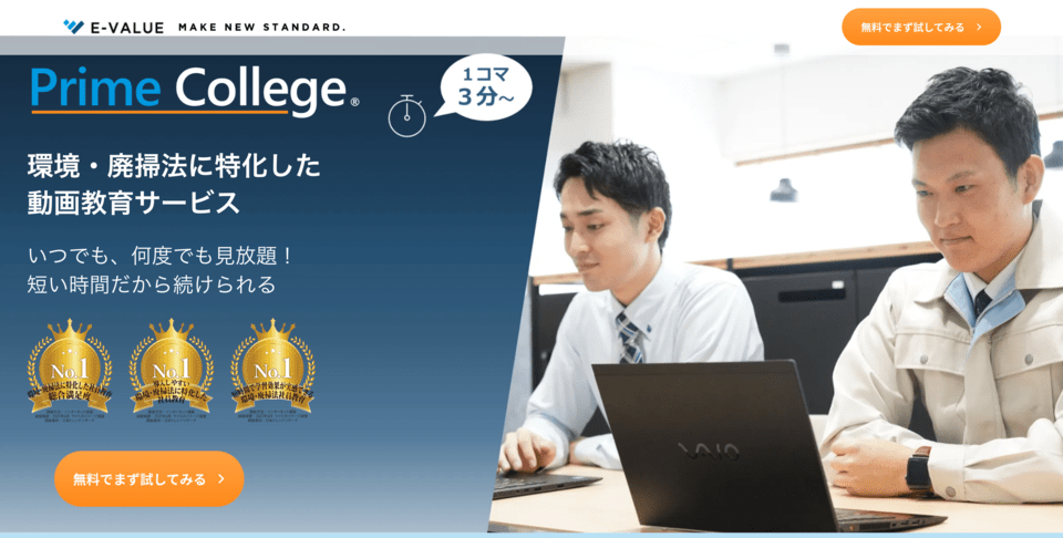 「Prime College」は、環境・廃掃法に特化した動画教育サービスです。廃掃法のポイントなど必要な情報を3~5分で学習可能なほか、社員の学習状況を一元管理管理できます。