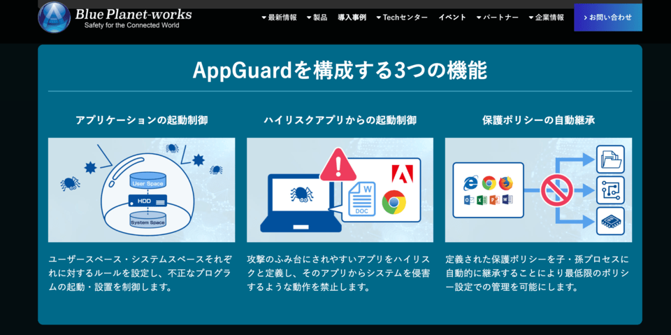 「AppGuard」は、新設計の「OSプロテクト型」セキュリティ。マルウェアを検知して駆除するのではなく、攻撃自体をブロックして無効化。万が一、悪意のあるプログラムに侵入された場合も防御します。