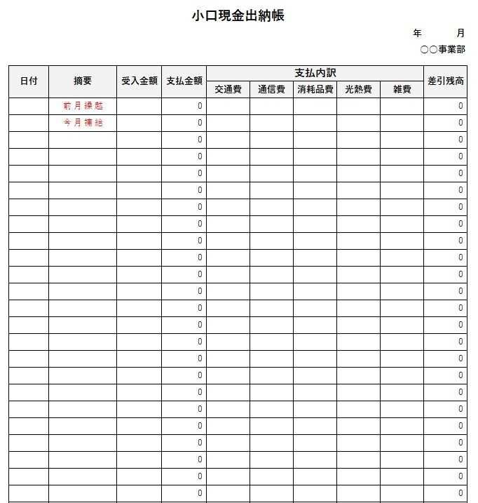 | 残高 | 取引後の小口現金の残高を計算して記載します。場合によっては「前月繰越」や「今月補給」といったかたちで摘要に記入し、残高の欄を設けないこともあります。 |