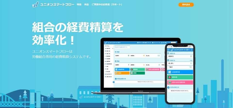 「ユニオンスマートフロー」 は、労働組合の経費精算を効率化するクラウド経費精算システムです。組合専用会計システム「Web財政部長」との連携で、仕訳が自動化されます。スマートフォン上での操作も可能なため、移動中にも経費精算を行えるようになります。