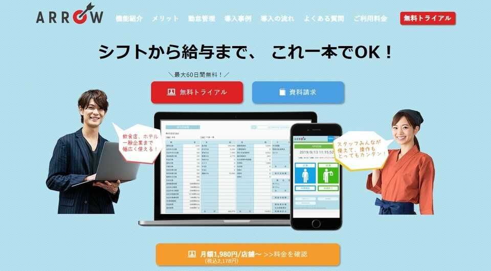「ARROW」 は、クラウド型の労務管理システムです。シフト管理や給与計算もシステム上で簡単に行えます。給与明細や離職票など、各種帳票の出力も可能です。一般企業だけでなく、飲食店やホテルなど、シフト調整が必要な業種にも対応。スタッフからのシフト要望もスマートフォンから行えるだけでなく、勤務メンバーや人件費もカレンダーから簡単に把握できます。