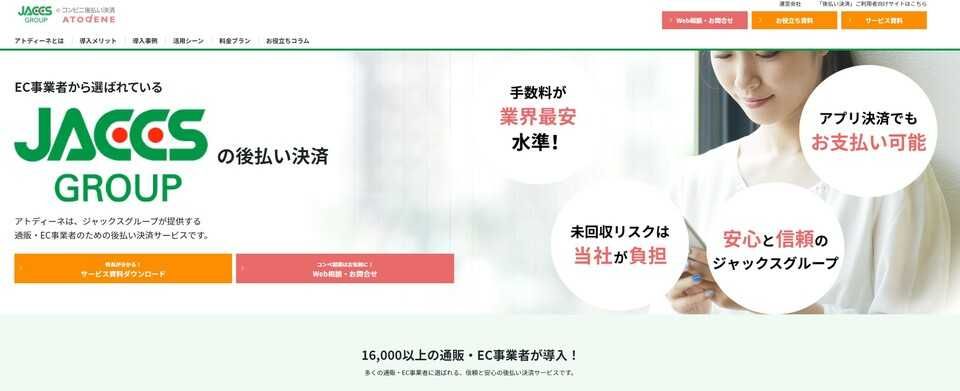「アトディーネ」 は、ジャックスグループが提供する後払い決済サービスです。通販・EC事業に欠かせない後払い決済サービスを、業界最安水準の手数料で提供。入金確認や督促業務にかかる負担を軽減できます。業界トップレベルのスピーディーな審査で、与信に時間がかかりすぎることもありません。未収金リスクも「アトディーネ」が保証。安心して事業を展開できます。