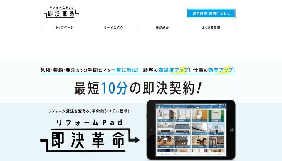 「即決革命」は、iPad上で見積り、契約書の作成、契約まで行えるリフォーム受注サービスです。住宅リフォームにかかる煩雑な事務作業を効率化し、顧客を待たせることなく円滑に契約まで進められます。スムーズな提案・契約によって、顧客満足の向上、機会損失の防止にも役立ちます。