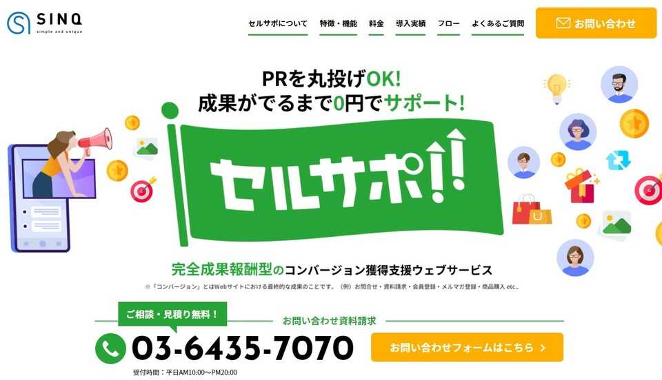 「セルサポ!!」は、完全成果報酬型のコンバージョン獲得支援(セールスサポート)サービスです。LPの構築からプレスリリース配信、インフルエンサープロモーションも提供。管理画面でコンバージョンも簡単に確認できます。完全成果報酬型のため、コンバージョンが発生するまでにかかる費用は0円。コストを抑えながらPRを行えます。