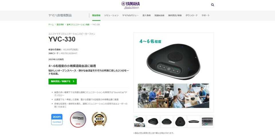 「ユニファイドコミュニケーションスピーカーフォン『YVC-330』」 は、複数名のリモート会議でも快適に利用できるスピーカーフォンです。雑音の多い環境下でもクリアな声を届けられます。