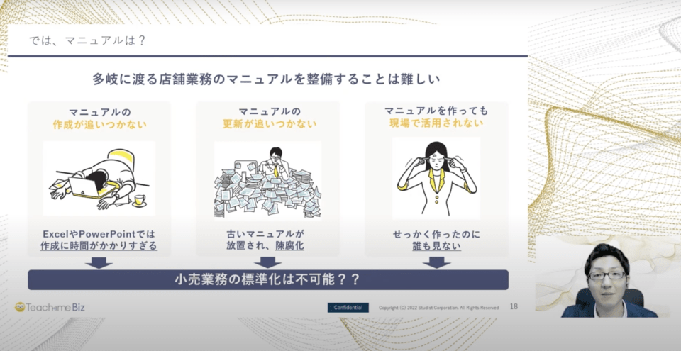 伊藤氏:業務を標準化したい、しかしマニュアルの運用管理には手間やコストがかかりすぎる。このような課題は、「Teachme Biz」による人材教育のDX化で解決できます。