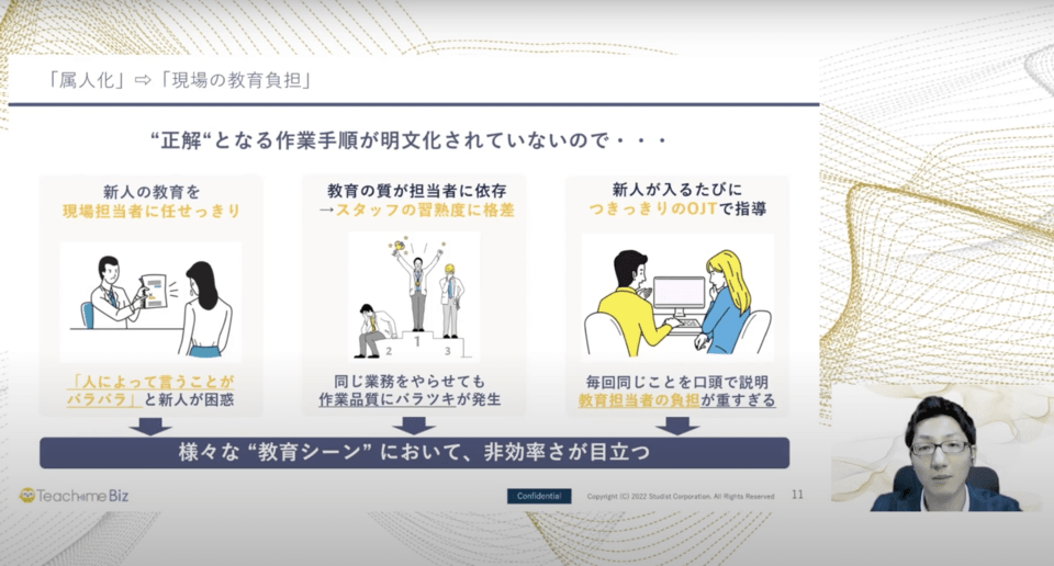 伊藤氏:いずれの課題でも、根本的な課題は業務の属人化にあります。つまり、業務の属人化を解決できればこれらの課題も解決できるのです。業務の属人化による弊害がまだあらわれていない企業でも、多店舗展開に踏み切ろうとしたときに課題が表出し、ビジネスチャンスを逃すことになりかねません。